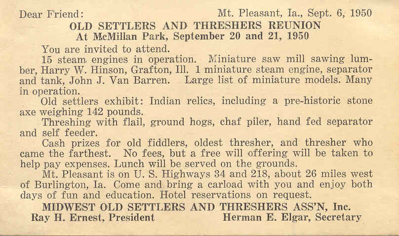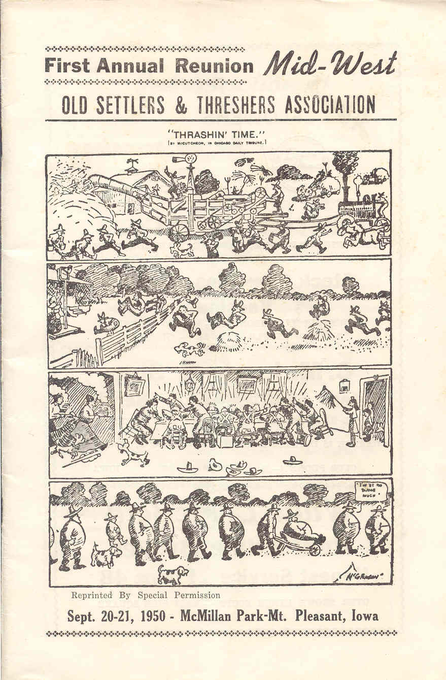 After several winter meetings, the election of a Board of Directors, and lengthy discussions about a Mount Pleasant event, the Association was chartered on August 21, 1950, and the first Reunion was held September 20–21, 1950. Records show that 15 steam engines and 8 separators were exhibited, with an estimated 10,000 people attending the first Reunion.