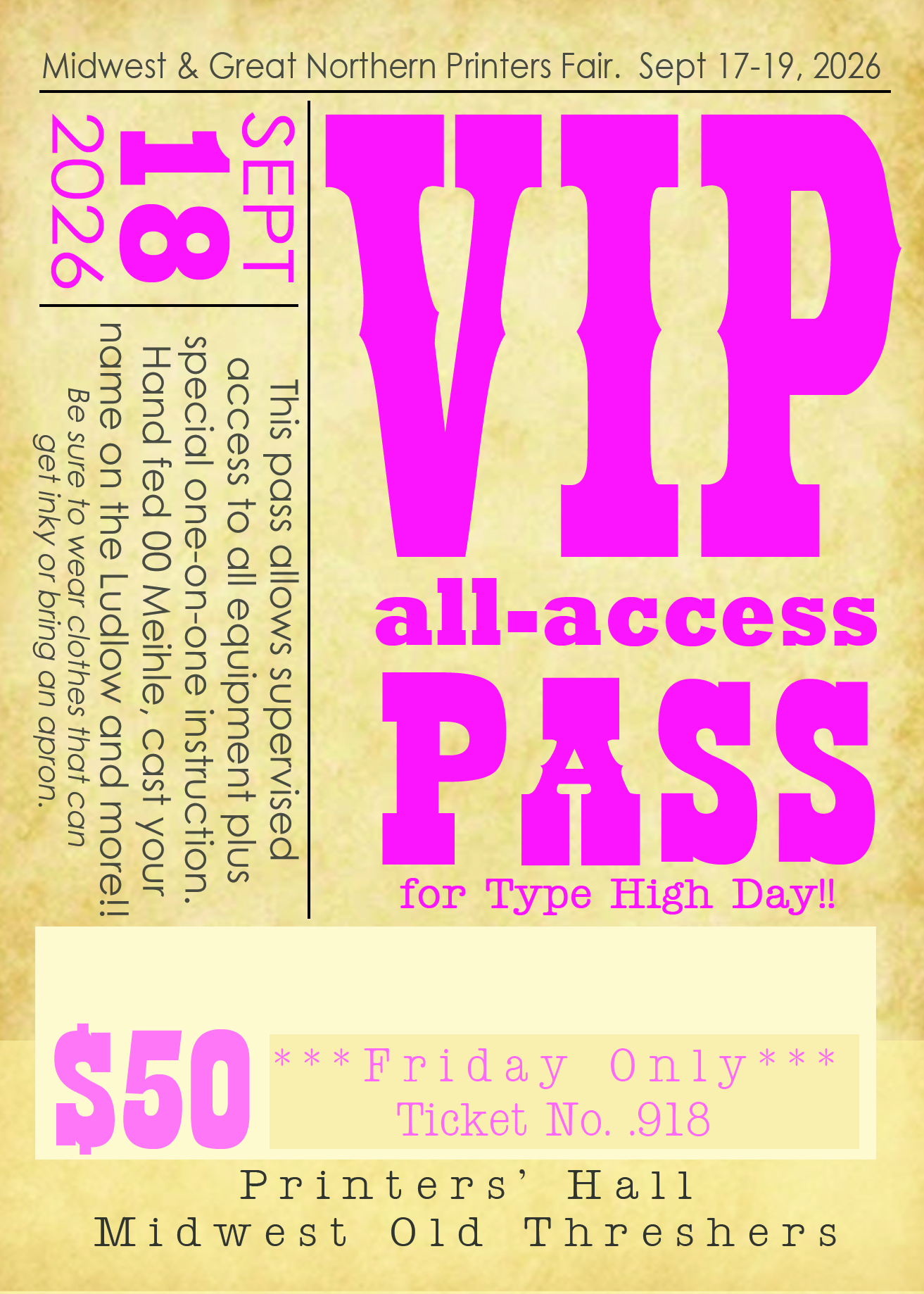 Printers' Hall demonstrations will be happening all day Friday. Purchase a $50 VIP PASS and receive special perks and supervised full access.  Hand feed the 14-ton 00 Miehle press (great photo-op), cast your name on the Ludlow, make your own paper, run the thermography machine, and so much more!!  Purchase your VIP PASS before Monday, September 14th; it will be waiting for you when you arrive at the Fair.